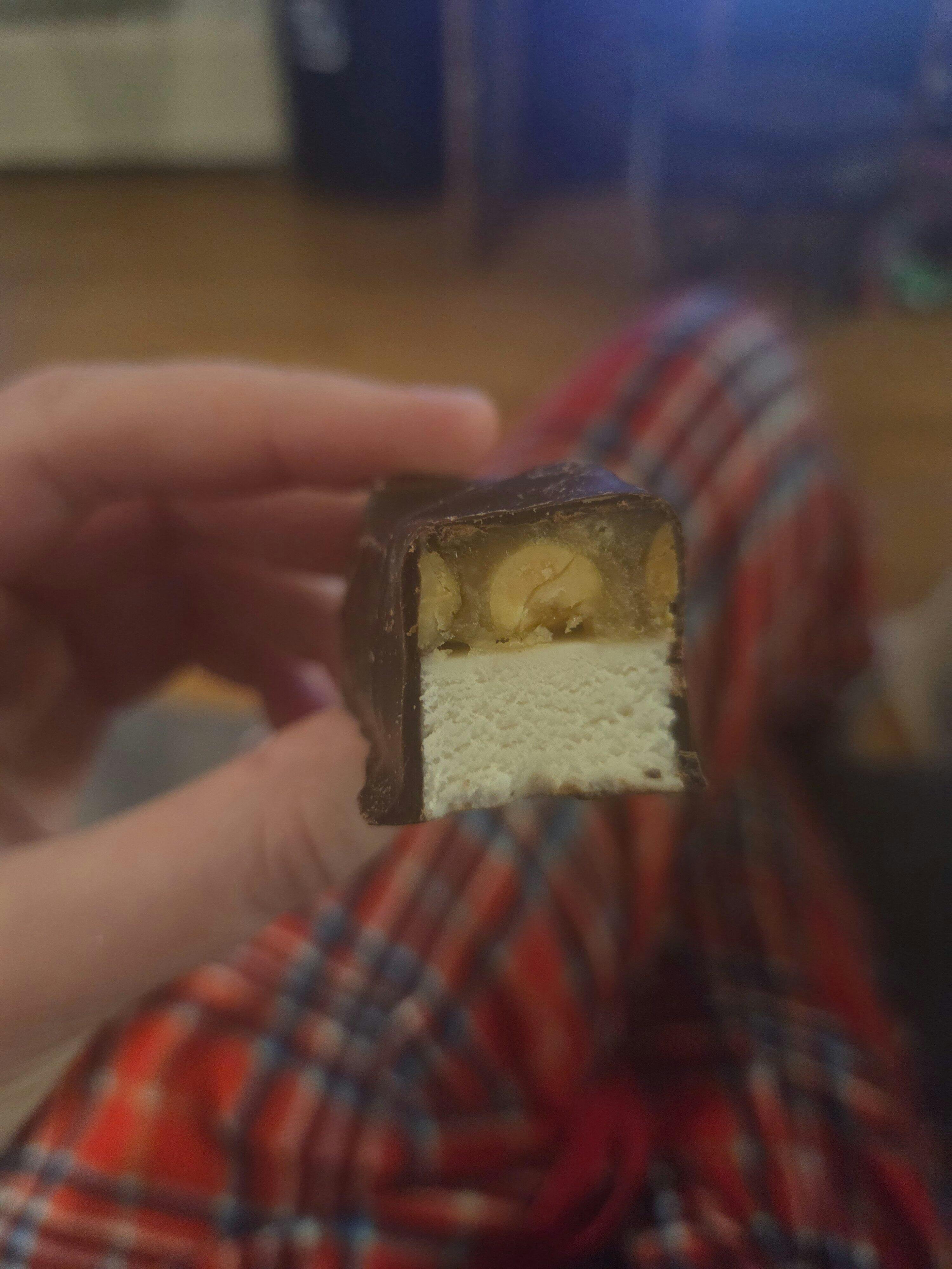 A delightful treat with layers of chocolate, peanuts, nougat, and caramel.